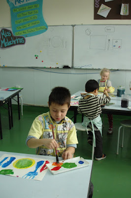I also got a kick out of William's painting. At the beginning of class, I explained to the kindergarteners what they need to be ready to paint. I compared it to a place setting for a Western meal. We looked at a drawing on the board of a plate, cup, napkin, knife, fork, and spoon. We mentioned how we would need different things to eat Chinese, like chopsticks. All those things make us ready to eat our food.